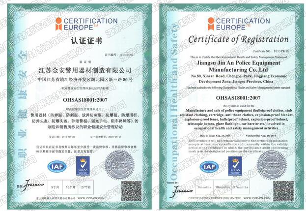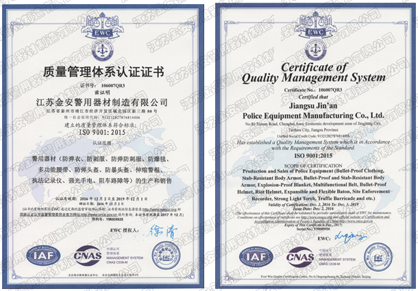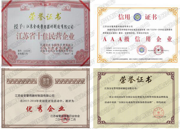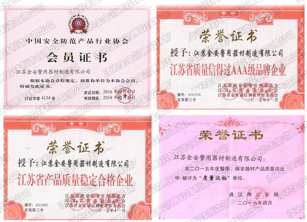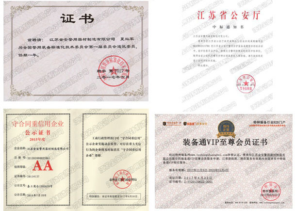第一批新型單警裝備定點生產(chǎn)企業(yè) 公安部警用裝備采購中心協(xié)議供貨單位 公安部防彈防刺服生產(chǎn)定點企業(yè) 江蘇省公安廳防彈衣入圍企業(yè) 江蘇警用裝備行業(yè)協(xié)會會員單位 中國刑事科學(xué)技術(shù)協(xié)會團隊會員單位 中國安全防范產(chǎn)品行業(yè)協(xié)會會員單位 靖江市保安器材行業(yè)協(xié)會常務(wù)理事單位 全國警用裝備標(biāo)準(zhǔn)化技術(shù)委員會通訊委員 江蘇金安警用器材制造有限公司始創(chuàng)于九十年代初,公安部防彈防刺服生產(chǎn)定點企業(yè)、公安部警用裝備采購中心2..